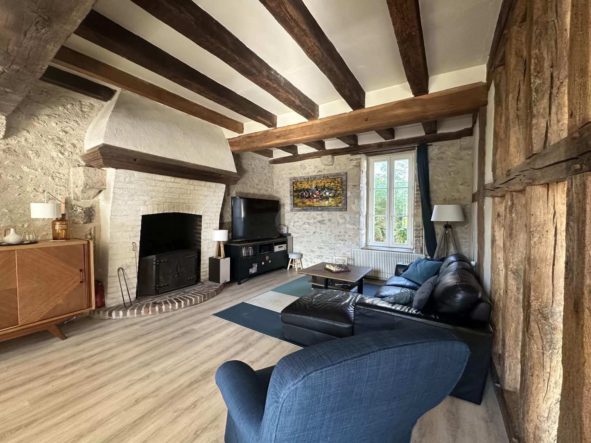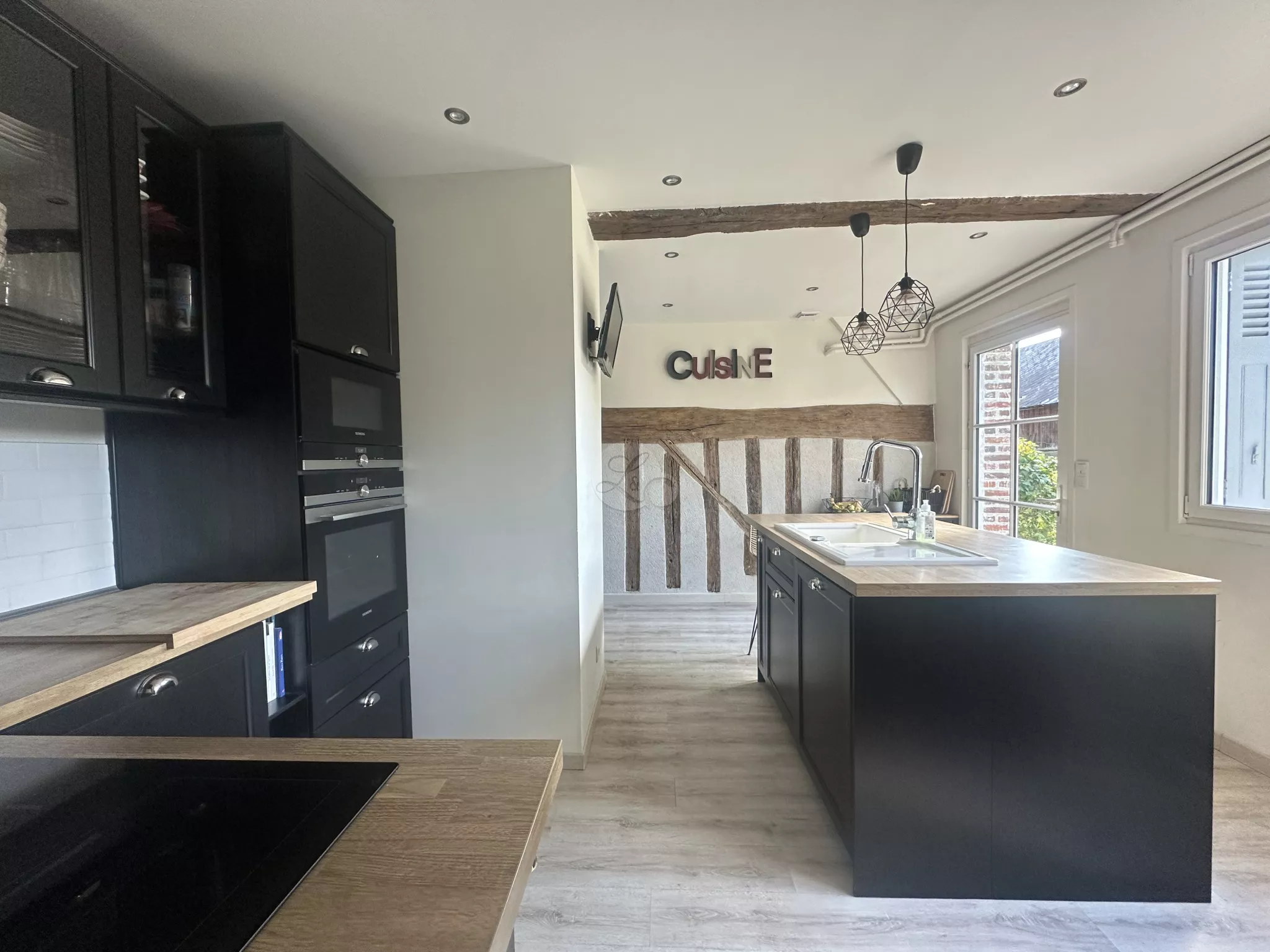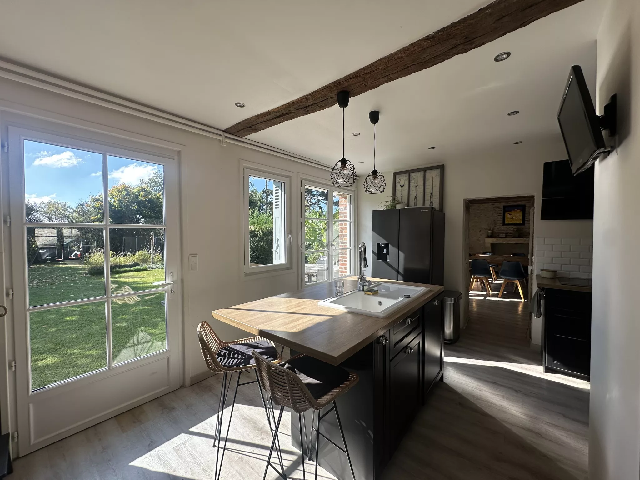 Dès l'entrée, vous serez accueilli par un vaste séjour lumineux sublimé par des colombages apparents, deux cheminées d'époque, et une atmosphère chaleureuse et élégante. La grande cuisine équipée avec son îlot central, résolument moderne, offre un espace convivial idéal pour recevoir.
