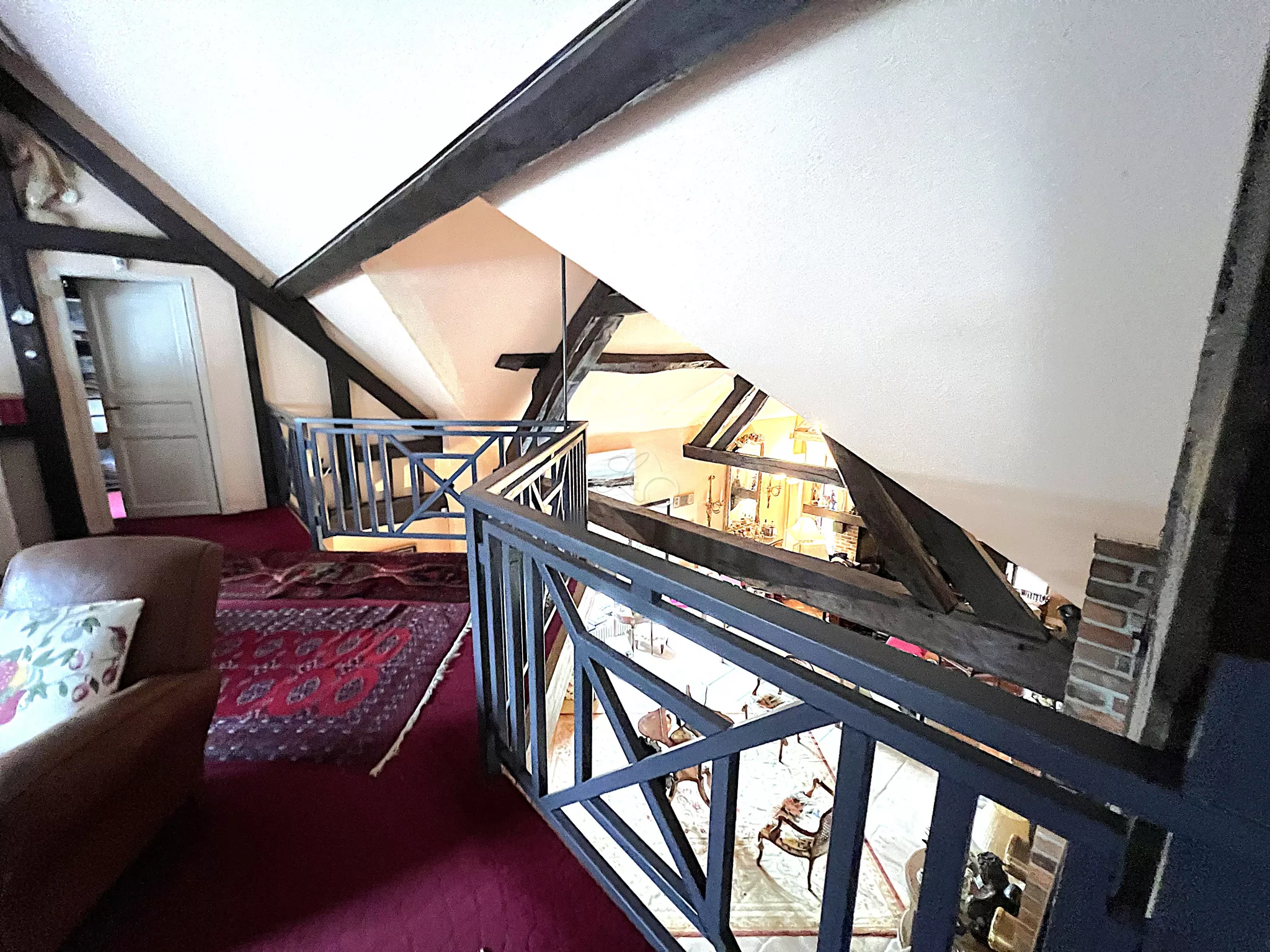 À l'étage, la partie droite propose une pièce ouverte pouvant accueillir un espace nuit et deux chambres équipées de lavabo. Depuis l'escalier principal, une vaste mezzanine distribue la suite parentale composée d'une chambre, d'une salle de bains et d'un WC, ainsi qu'une cinquième chambre située à l'autre extremité de la mezzanine.