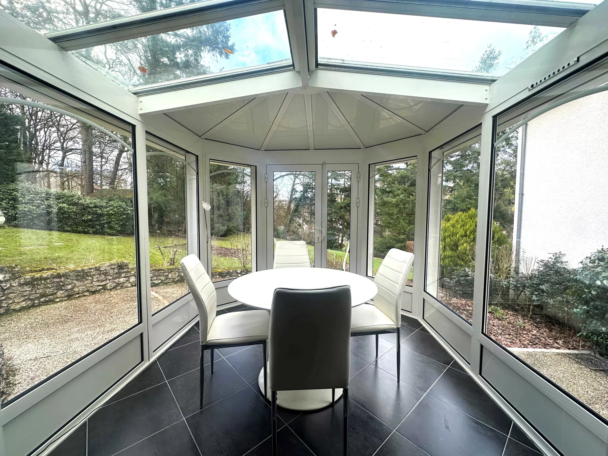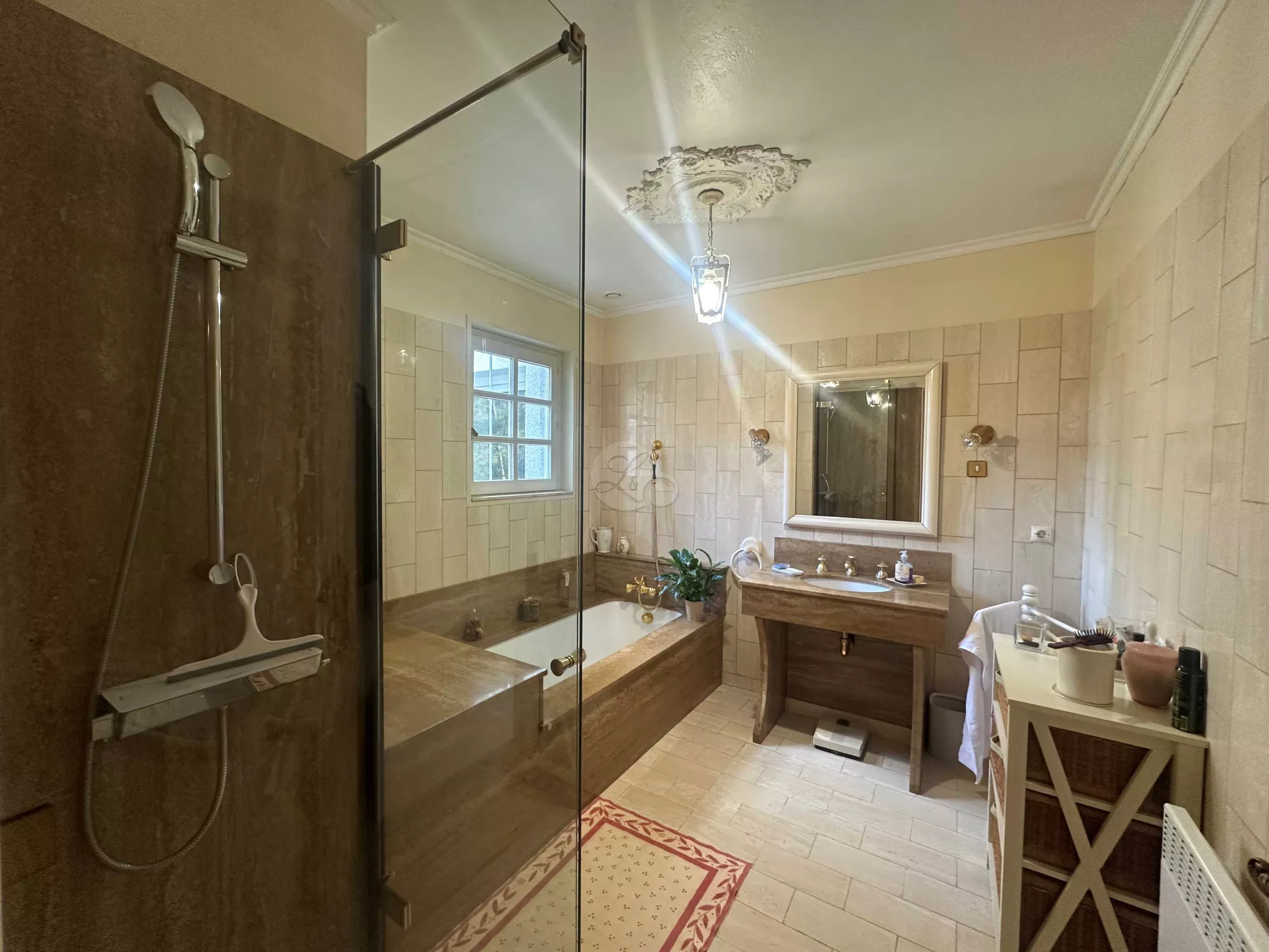 Le rez-de-chaussée dévoile une entrée suivie d'un agréable dégagement menant à un salon lumineux, habillé de marbre et agrémenté d'une cheminée. Un bureau doté d'un parquet ancien, ainsi qu'une salle à manger avec cheminée, prolongent ces espaces de réception. La cuisine aménagée et équipée, ouverte sur une véranda, offre un accès privilégié au jardin. Ce niveau comprend également des wc, une salle de bains avec douche et baignoire, un couloir, ainsi que deux chambres, dont l'une bénéficie d'un accès direct à la terrasse.