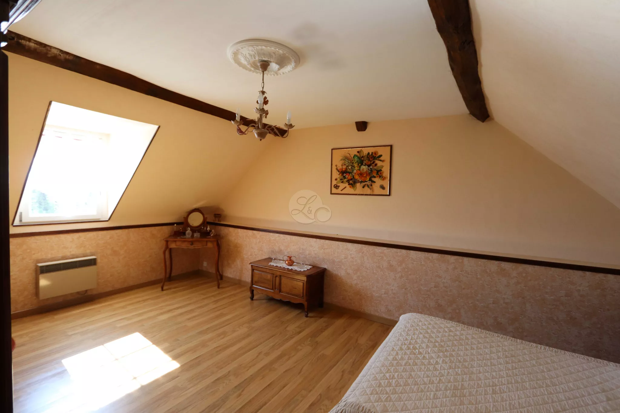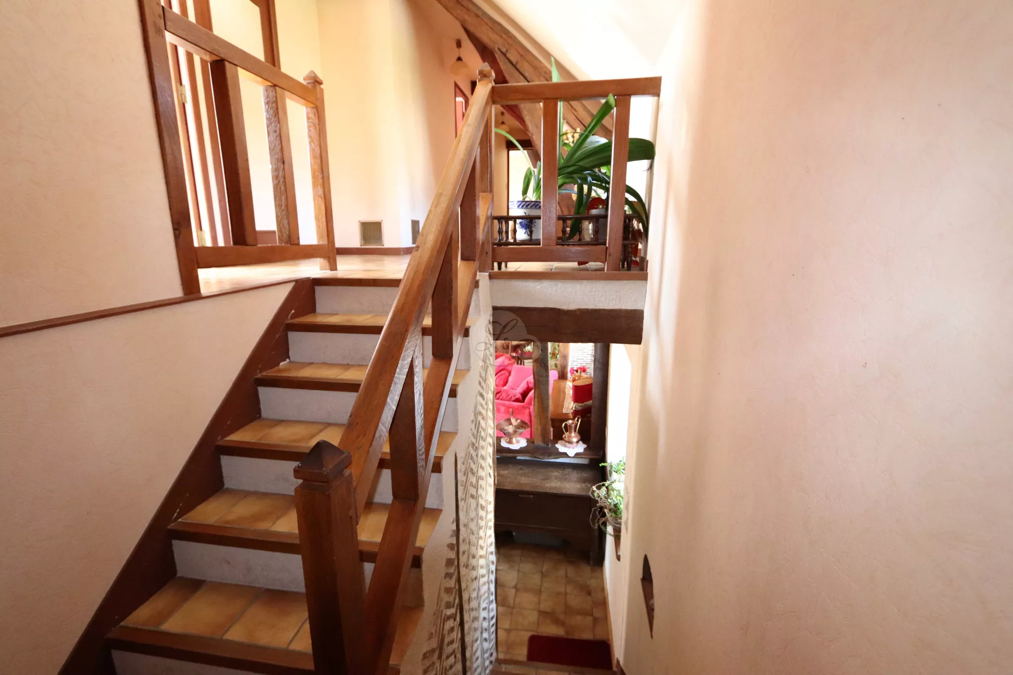 À l'étage, un couloir dessert une salle de bains prolongée par une petite terrasse donnant une vue dégagée sur la campagne environnante.Un second WC, un débarras permettant l'accès aux combles, ainsi que trois chambres composent le reste de l'étage.