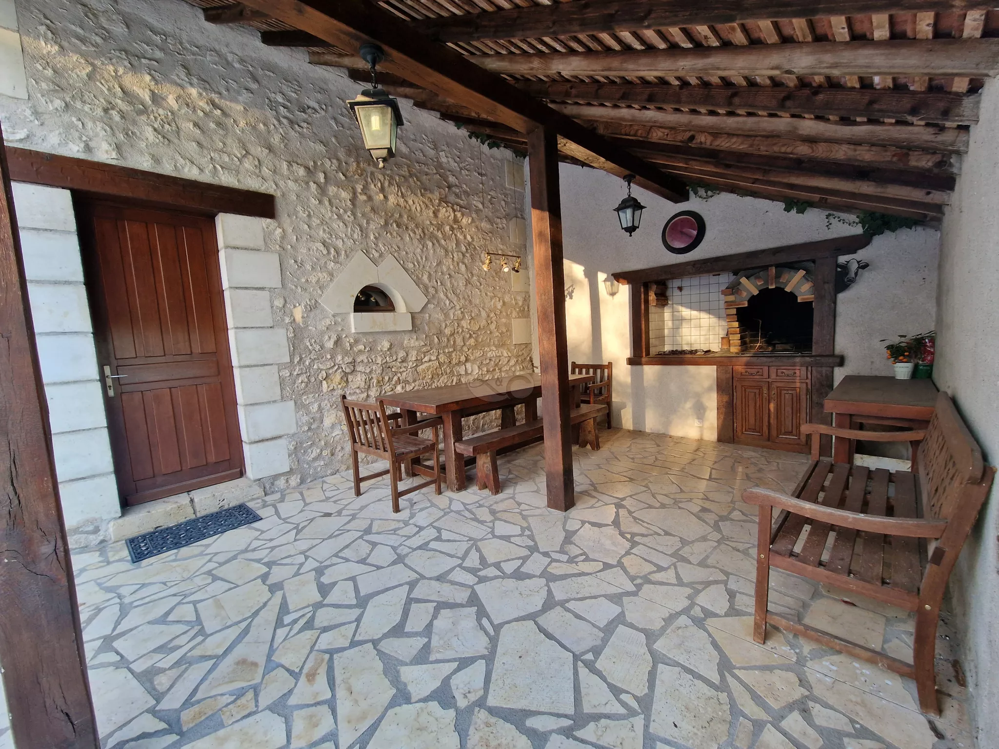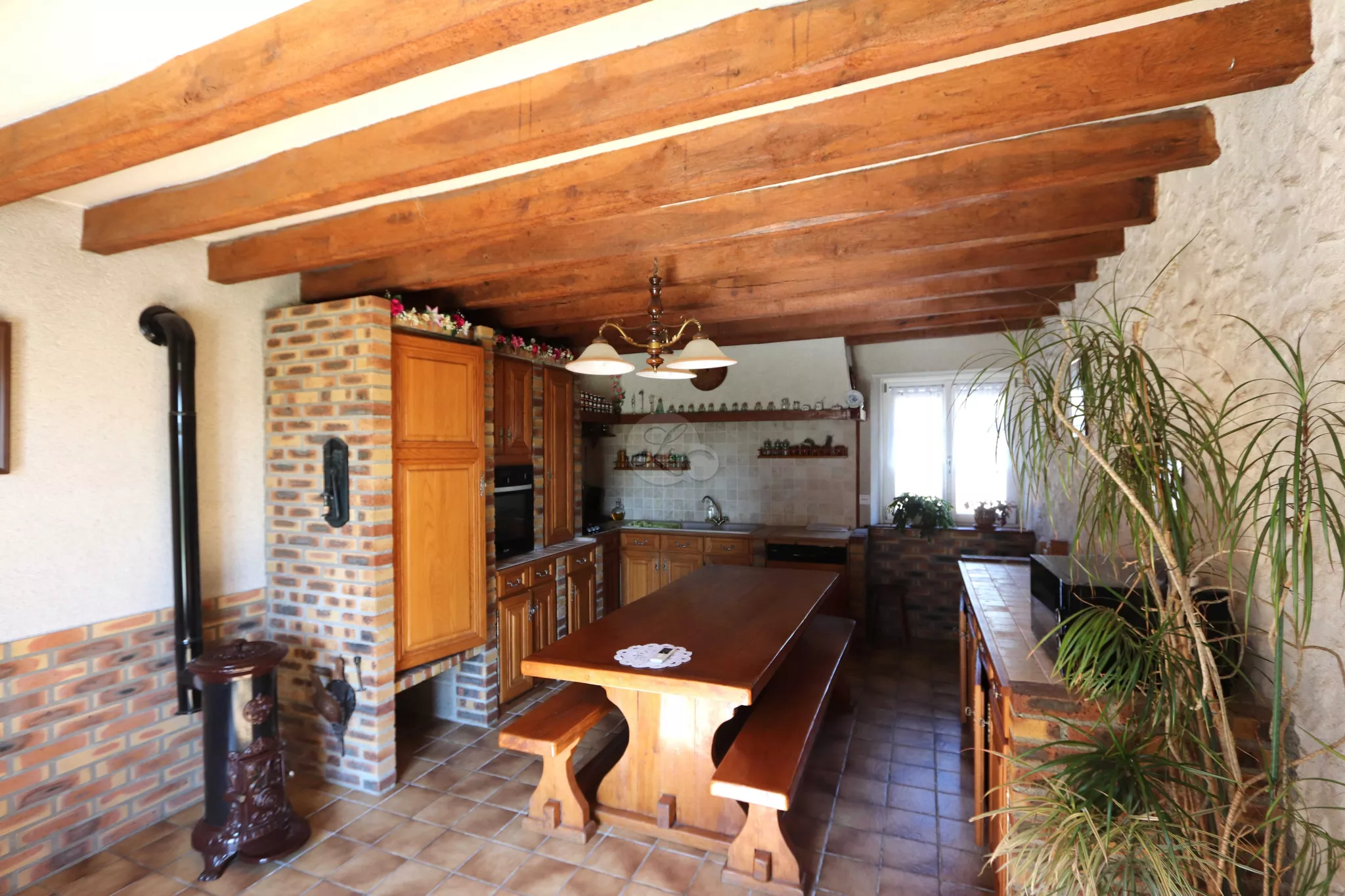 Au rez-de-chaussée, une cuisine aménagée et équipée ouvre directement sur une terrasse orientée sud-est. Le séjour, mis en valeur par ses poutres et pierres apparentes, bénéficie également d'un accès à l'extérieur. S'ajoutent des WC ainsi qu'une salle d'eau.