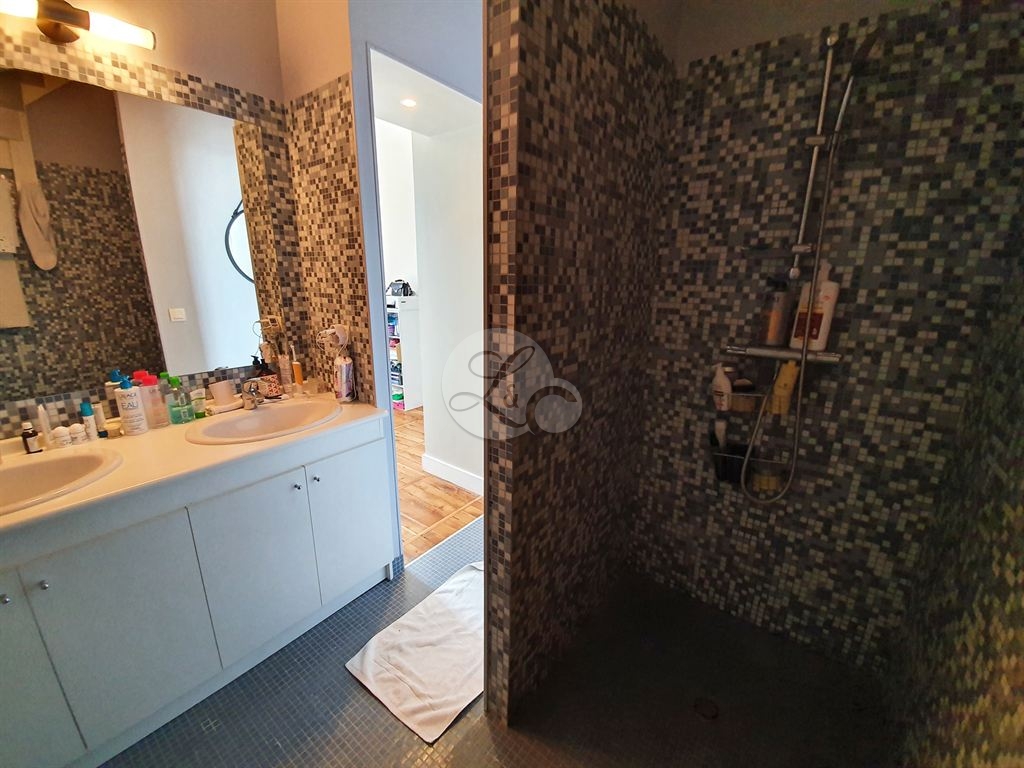 Entrée, cuisine équipée et aménagée (env 20m2), séjour avec cheminée, ouvrant sur le jardin (env 40m2), bureau équipé de placards (env 15,60m2), dégagement avec escalier, salle de bains, lingerie ouvrant sur le jardin, WC.