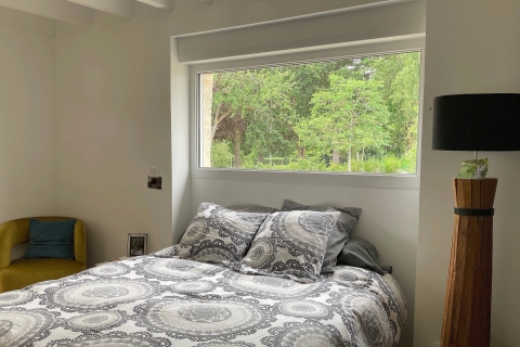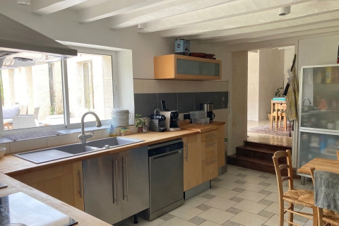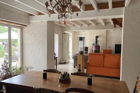 - Poêle à bois, poutraison, murs en pierre affleurante