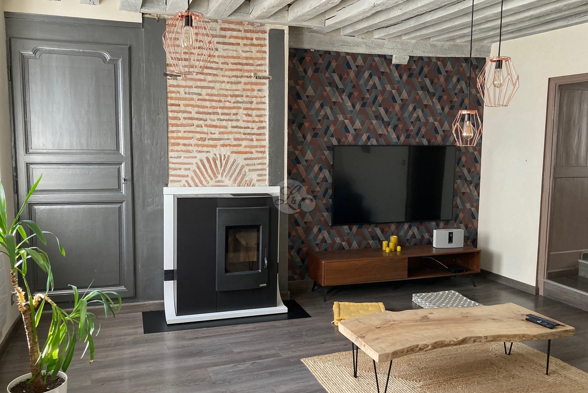 Salon équipé d'un poêle à granules, salle à manger, cuisine aménagée.